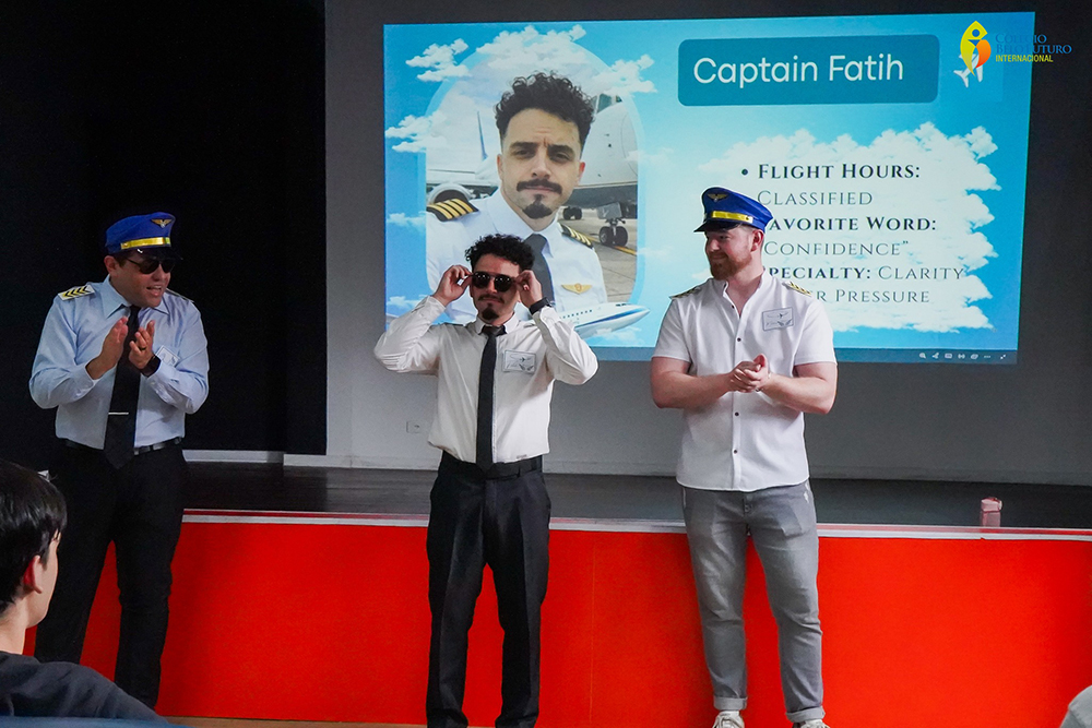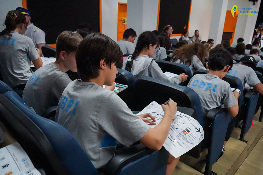 Nossos estudantes fizeram o check-in, sentaram nos assentos indicados no cartão de embarque e até receberam bebidas e guloseimas como se estivessem em um avião, e claro, tudo isso praticando a língua inglesa!